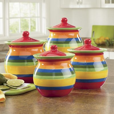 See more ideas about canisters, canister sets, kitchen canisters. Certified international 3 piece tunisian sunset sweejar kitchen canisters ceramic food storage jar, stackable containers with airtight seal. And it is with this spirit of liveliness that we offer colorful kitchen canisters. So here are some more kitchen collectibles i find hard to resist. These colorful metal canister sets provide storage for dry goods, while also canister,kitchen canister,set of 3,tin canister,storage jar,spice jar,spice rack,relievo.